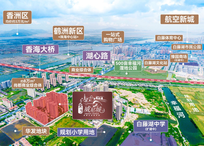 樓盤位于珠海湖心路核心地段,是百萬平方米低密度高綠化大型樓盤,毗鄰濕地公園,配套幼兒園,白藤湖中學,交通便捷(香海大橋500米,15分鐘到珠海市中心香洲。)